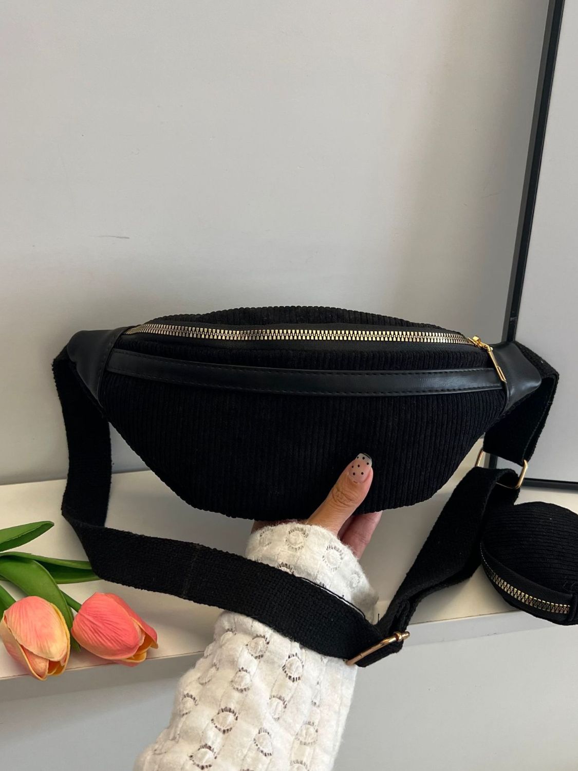 Corduroy Adjustable Strap Crossbody Bag with Pouch
